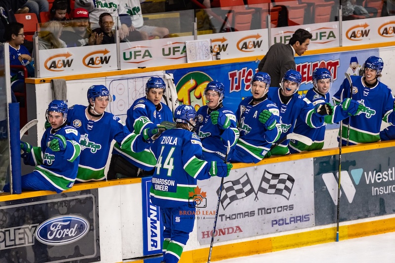Finally, the league’s last perfect team remained so, as the Flin Flon Bombers rode a three-goal third-period lead over the Warman Wolverines, and held on for a 4-2 win. Flin Flon locals Joey Lies and Wyatt Stinton both had a goal and an assist, while Kane Kennedy scored his first career SJHL goal in response for the Wolverines.